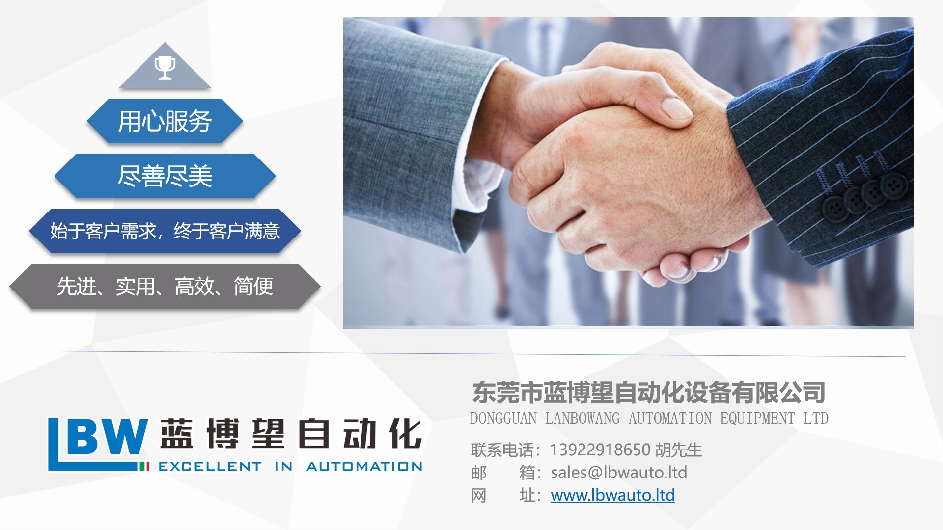 東莞市藍博望自動化設備有限公司 是一家專業從事自動化機械設備研發、制造、銷售服務于一體的自動化設備生產商與解決方案提供商,公司力爭以創新、求實、團結、奮進為企業精神,以誠信求發展,以質量求生存的經營理念,為顧客提供優質、高效、低耗、可靠耐用的產品與解決方案!公司自成立以來,始終堅持以先進的技術科學的管理,精益求精的產品品質致力于廣大客戶服務。
