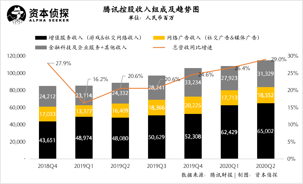 • 2020年二季度,騰訊增值服務業務的收入同比增長35%至人民幣650.02億元。