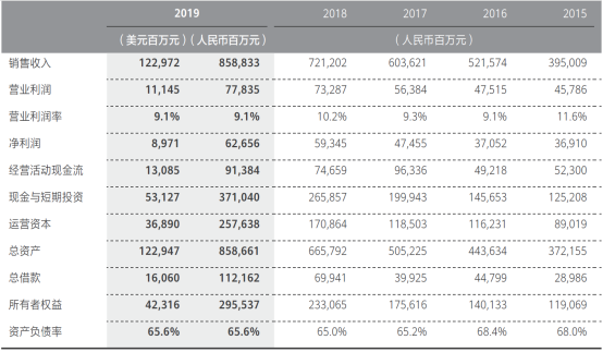 華為2019年年報披露的5年財務概要
