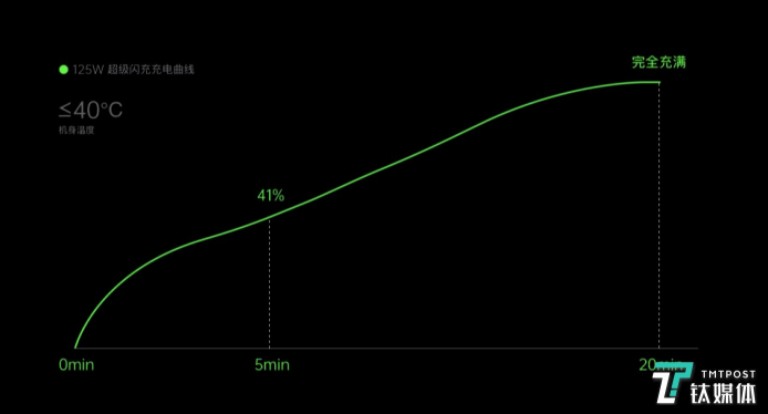 其中,vivo、小米、realme百瓦以上快充技術均表示在20分鐘內充滿一部手機。而OPPO的125W超級閃充,5分鐘可將等效4000mAh電池的手機充至41%,20分鐘充滿。同時,更將溫度嚴控在40度。而與各家不同的是,OPPO還同時推出了65W AirVOOC,在充電效率上已與此前最快有線充電速度不相伯仲, 30 分鐘充滿。